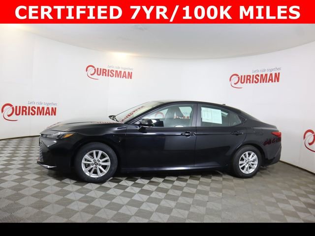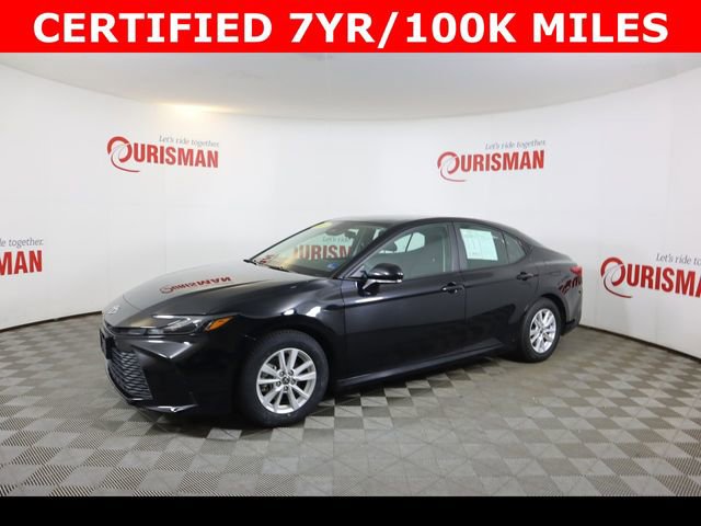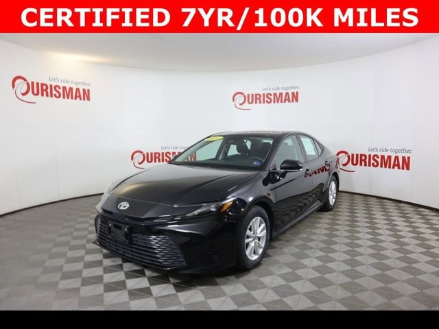 Certified. Midnight Black Metallic 2025 Toyota Camry LE FWD eCVT 2.5L 4-Cylinder 16V DOHC CARFAX One-Owner. CERTIFIED 7 YEAR/ 100,000 MILE WARRANTY, ABS brakes, Active Cruise Control, Alloy wheels, Electronic Stability Control, Front dual zone A/C, Heated door mirrors, Illuminated entry, Low tire pressure warning, Remote keyless entry, Traction control.